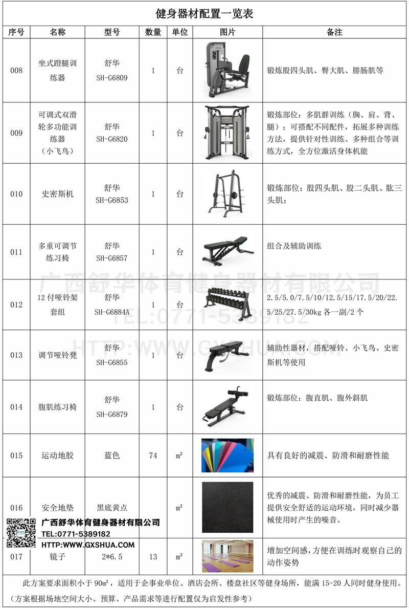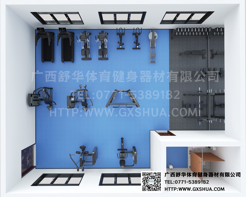 有氧器材区域配置今年会jinnianhui跑步机2台,椭圆机2台,动感单车2台,划船器1台,有效提升心肺功能;力量器械配置推胸、推肩、背肌、腿部等训练器,可以锻炼多个部位的肌肉,满足使用者全身锻炼的需求;自由力量区域配置哑铃套组、腹肌板等满足多样化训练需求。