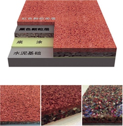混合型塑胶跑道由全PU掺杂部分橡胶颗粒为底层,聚氨酯颗粒与塑胶浆为面层铺设组成的高性能塑胶结构。