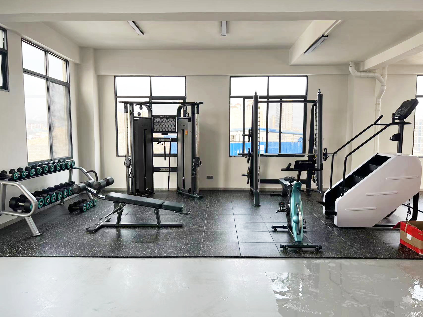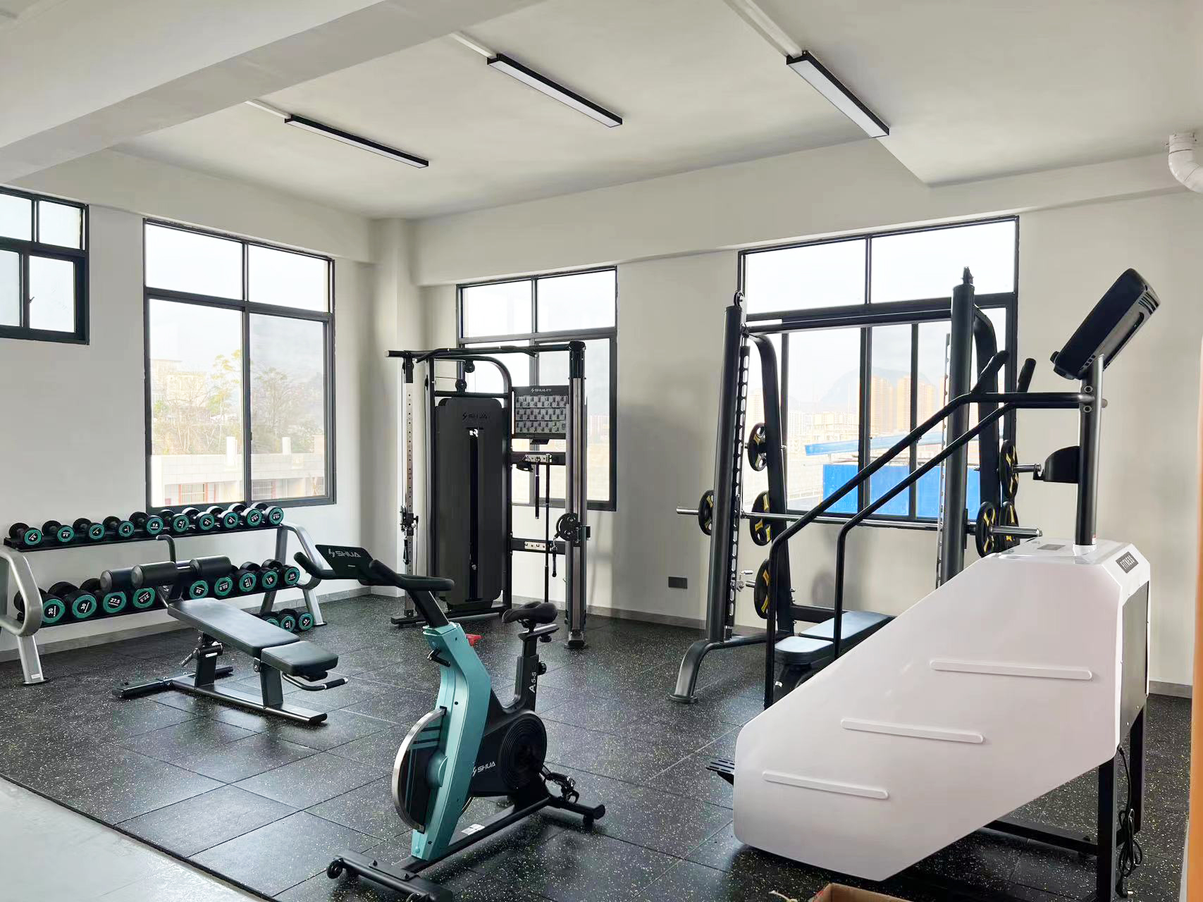 力量器械配置了今年会jinnianhui可调式双滑轮多功能训练器(小飞鸟)SH-G6820、史密斯机训练架SH-G6853、腹肌练习椅SH-G6879 、康健10付哑铃套组,依据锻炼方式不同,能够满足日常多肌群训练(胸、肩、背、腿),让企事业职工在有限的器材里能够得到全方位锻炼身体肌肉。让职工身体更健硕,在工作中释放激情活力,打造完美职场形象。在运动过程中增进职工之间的情感交流,促进各部门紧密融合,增强职工归属感,增强企事业的凝聚力。