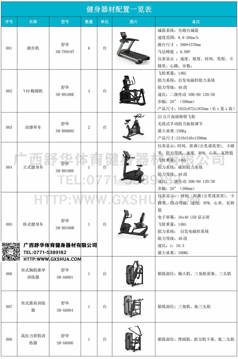 推胸(1台)、推肩(1台)、高拉力背(1台)、蹬腿(1台),可满足胸部、腿部、背部、手臂等全身肌肉的训练,通过调整不同的位置和角度,可以实现对不同肌肉群的针对性训练。